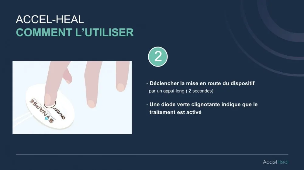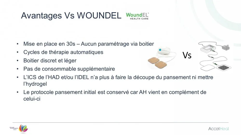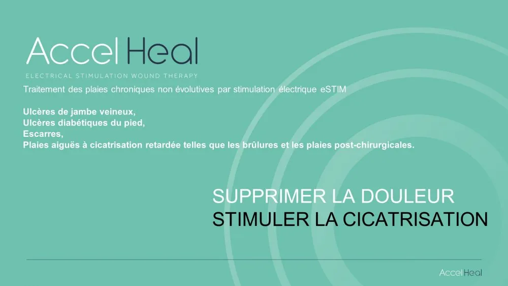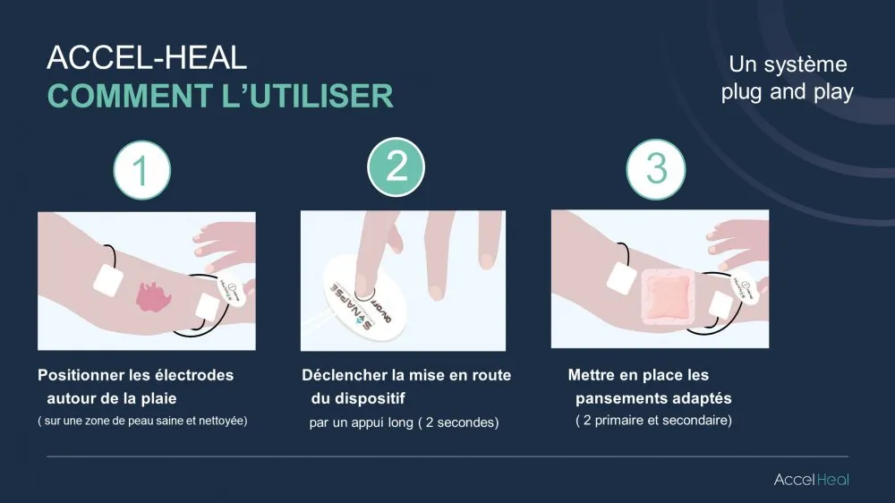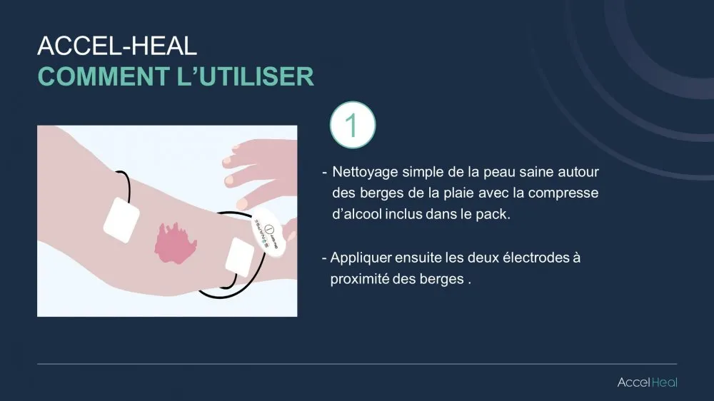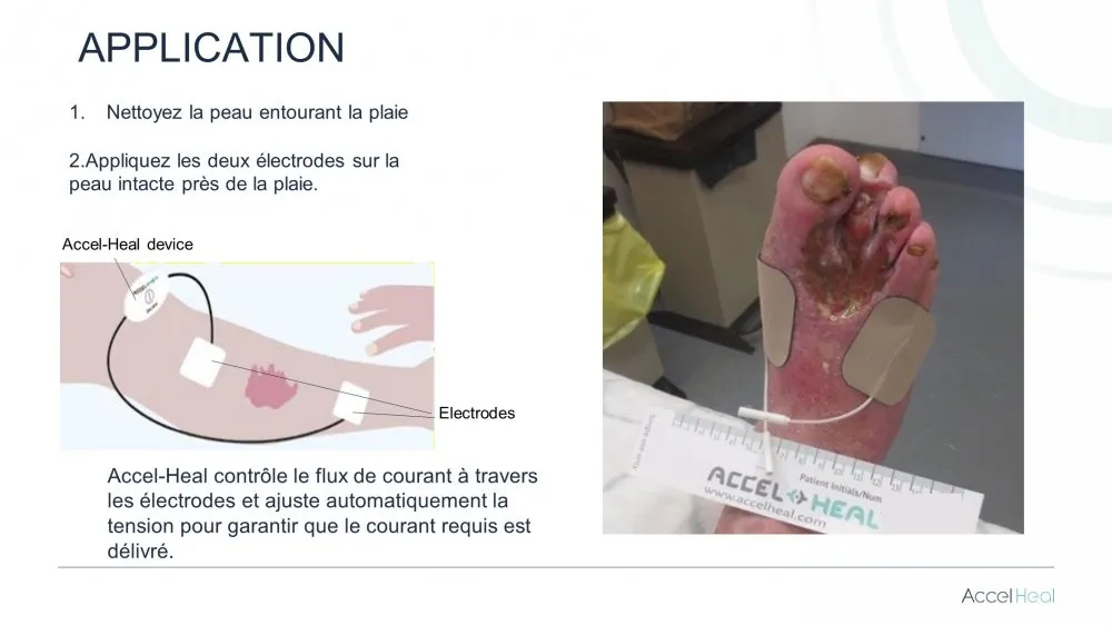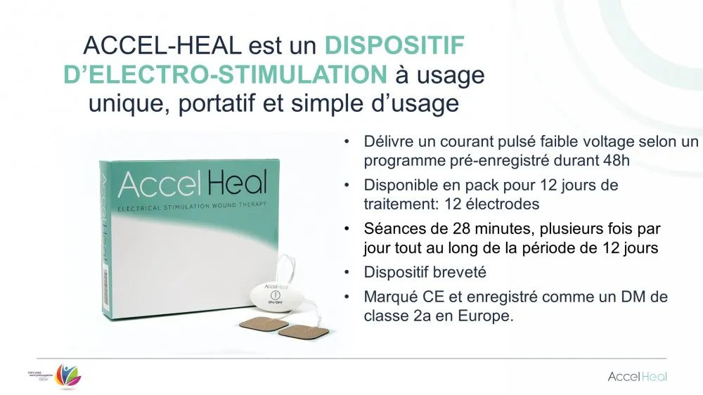 Accel-Heal® est un dispositif médical à usage unique, conçu pour stimuler la cicatrisation de traitement des plaies par électro stimulation.