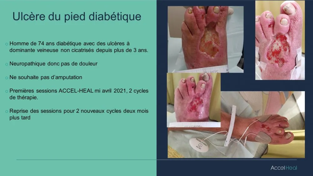 Accel-Heal est indiqué dans le cas de plaies chroniques comme les ulcères veineux, pieds diabétiques, brûlures ou même plaies post-opératoire déhiscentes.